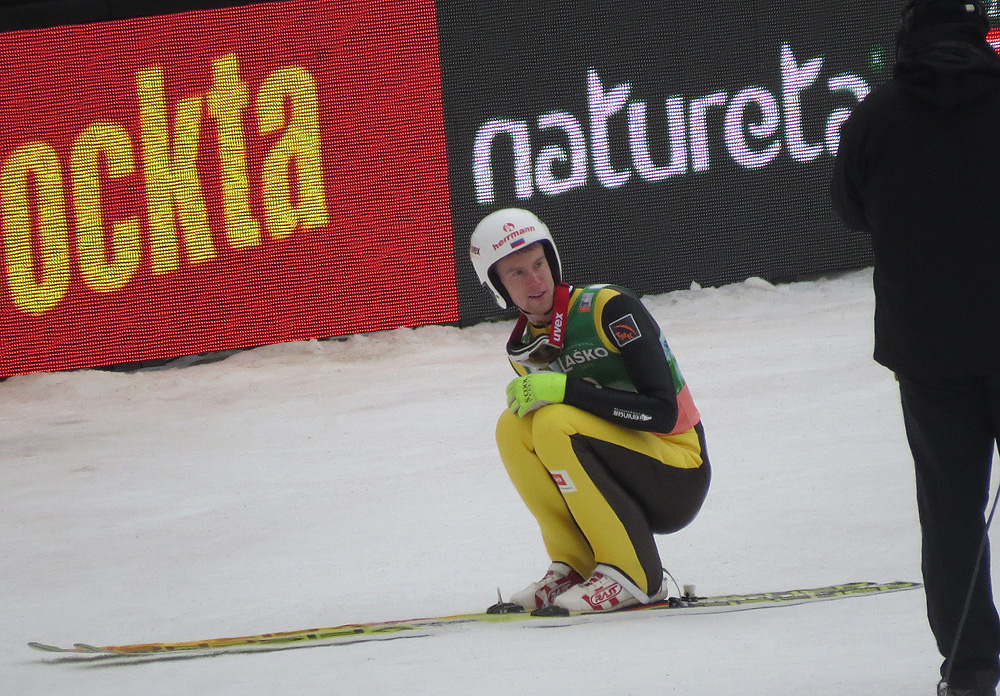 А во-вторых, всё самое интересное всё равно происходит в районе К-пойнта. Кто где приземлился! По-словенски — «упал»%) Диктор вещает: «251 метр Камил Стох упал» (с) %))) Хотя он вовсе не упал, а очень даже удачно завершил свой прыжок с новым рекордом этого трамплина.